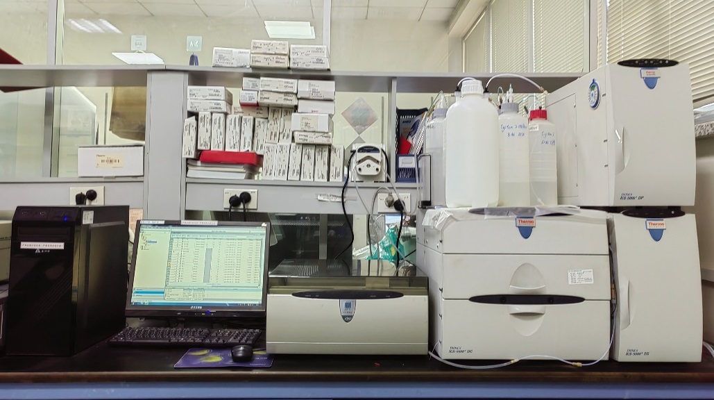 由高压泵系统、自动进样器(50位)、电导检测器、脉冲安培检测器、抑制器、柱温箱、数据处理系统及多通道梯度混合器等组成。采用双活塞往复泵,提供高达40 MPa压力,实现高精度流速控制(0.1–3 mL/min),适用于复杂样品的高效分离。在线抑制器有效提升离子分析灵敏度并降低背景噪声,梯度混合器支持多通道洗脱策略。整套系统通过Chromeleon软件实现自动化控制与数据分析,支持离子、糖类及氨基酸的多模式方法开发与批量分析。